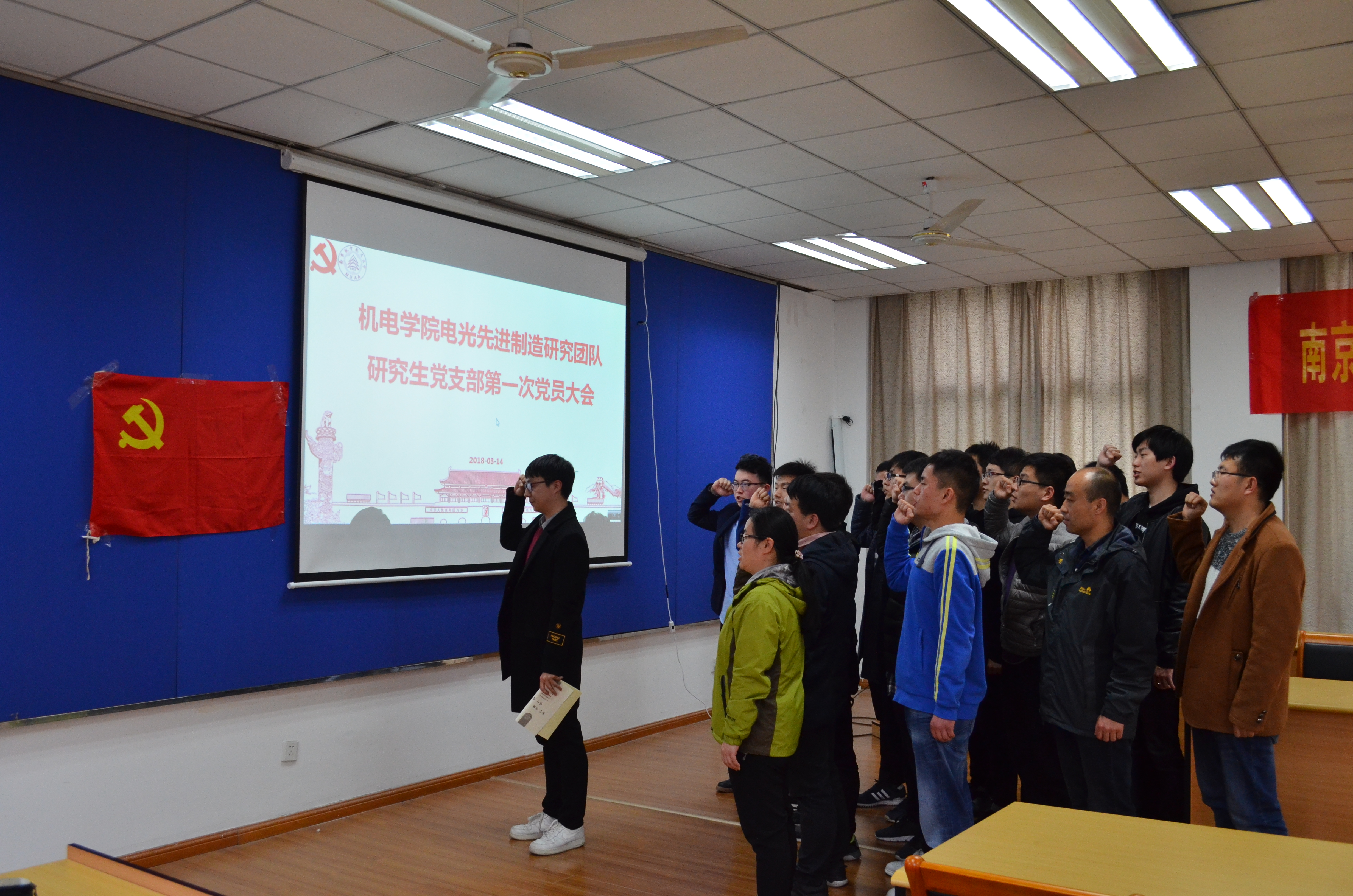 支部成立大会结束后紧接着召开了电光先进制造研究生党支部全体党员大会。大会投票选举产生了电光先进制造研究生党支部第一届委员会,支部委员会选举博士研究生焦晨同学担任支部第一任书记。焦晨同学带领参加大会的全体研究生党员在庄严的党旗下重温入党誓词,要求全体党员不忘初心,砥砺前行。