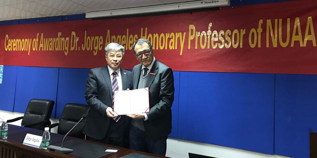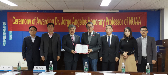 授予仪式由国际合作处主任沈敏主持,跳蛋自慰 院长傅玉灿向与会人员介绍了Jorge Angeles教授的简历,校长助理熊克为Jorge Angeles教授颁发名誉教授聘书并佩戴南航校徽。Jorge Angeles教授发表致辞,表达了与南航开展更加广泛密切合作和共同在专业领域做出更多贡献的期待。受聘仪式结束后,Jorge Angeles教授为我校师生作了题为《Form, Reciprocity and Structure in Multibody-system Models》的学术报告。