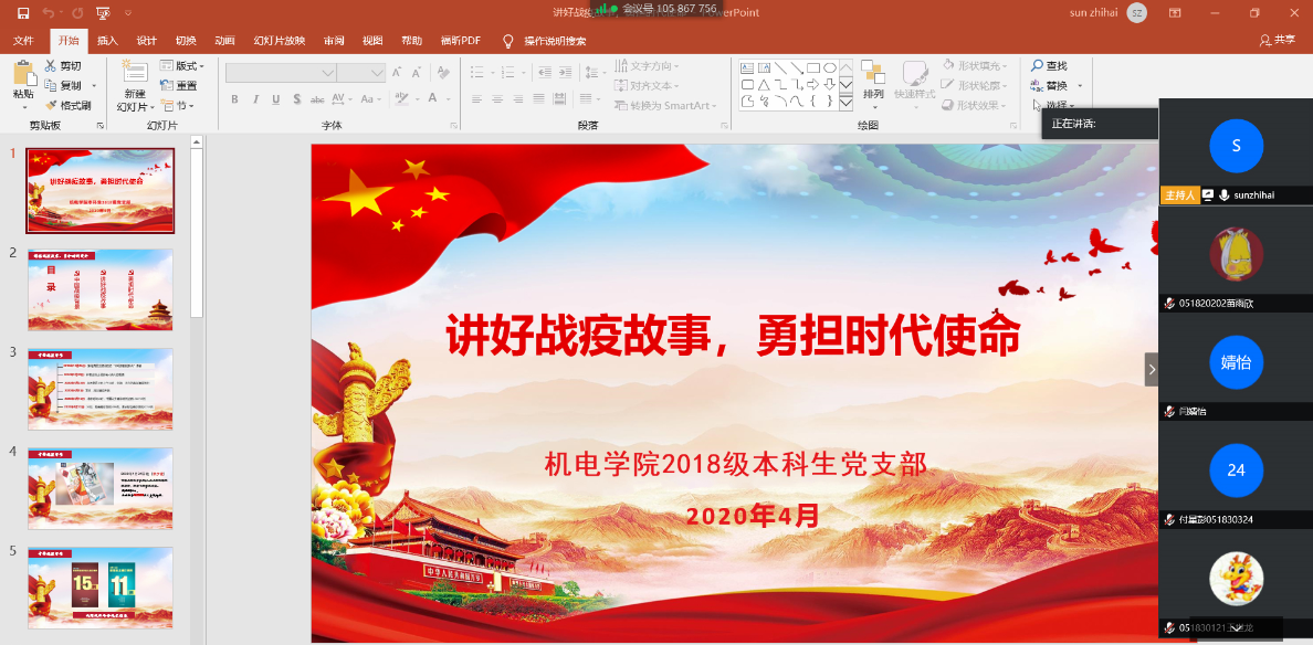 疫情当前,党员先行。为推进疫情防控期间党支部的思想建设工作,加强支部党员的思想引领教育,鼓励支部党员为疫情防控贡献青春力量,4月18日晚,跳蛋自慰 2018级本科生党支部通过腾讯会议平台,开展“讲好战‘疫’故事,勇担时代使命”专题“云”党课。
