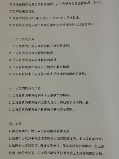 通过与江苏海洋大学创新创业学院、淮海社区和电光团队的三方会谈,决定由智汇•雨露公益团队协助创新创业学院以淮海社区为基础,依托高校科技资源,打开高校大门,创新科普形式,借鉴“132”成功模式,为社区打造科创空间公益科普服务网点,长久服务更多的社区中小学生。会议期间,三方还就具体合作细节、2020-2022年合作大概方案进行了讨论交流,并达成共识,共同签订了《智汇•雨露公益计划合作协议》。